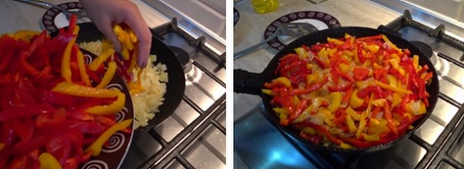 3. Обжарим на сковороде лук на растительном масле до золотистости. Потом добавим к нему болгарский перец. Продолжим жарить на среднем огне 7-10 минут, периодически помешивая.