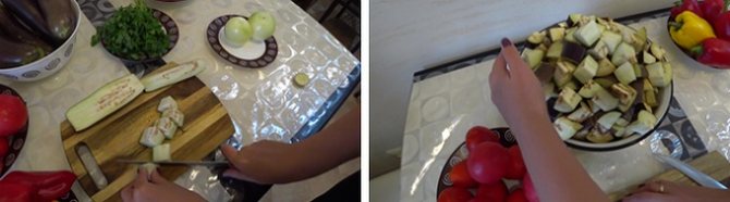 1. С чего мы начнем? С подготовки овощей! Баклажаны нарежем крупными кубиками, примерно по 3 см. Выложим их в отдельную миску.