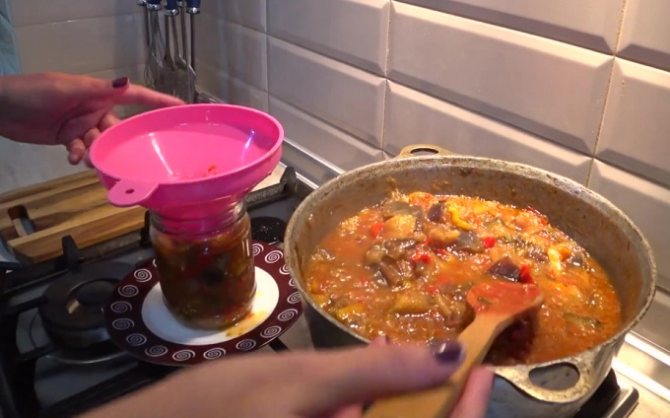 Полученный соус идет на заправку обжаренных баклажан, которые аккуратно перемешиваем. Все, закуска готова, можно заполнять ею простерилизованные банки. Заполненные емкости устанавливаем в большую кастрюлю, заполненную водой и стерилизуем таким образом на плите минут 40 примерно. Затем емкости можно закрывать прокипяченными крышками.