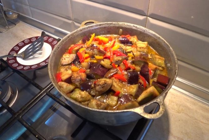 4. Когда овощи немного размягчатся, поставим на плиту большой казан. В него будем добавлять слоями перец с луком, потом кубики баклажан. Сразу немного посолим и поперчим. Таким образом послойно заполним всю емкость. Поступаем так исключительно с целью равномерного распределения ингредиентов в казане.