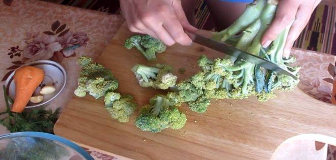 - В первую очередь вымываем хорошо брокколи и разбираем на соцветия. Кочерыжку убираем.