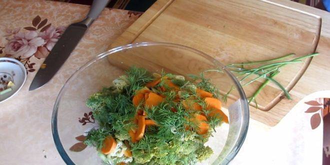 - В миску перелить воду и растворить в ней примерно 4 г соли. Переложить в миску соцветия.