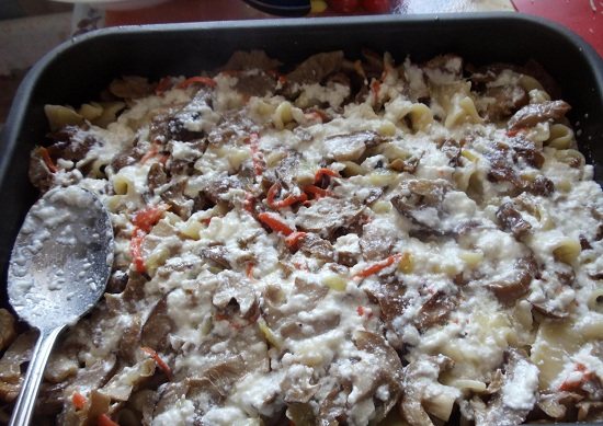 - Смазываем огнеупорную форму маслом. Выкладываем слой из макарон.