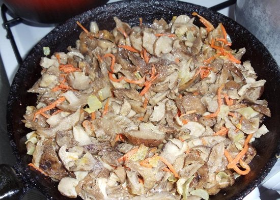 - Сцеживаем с отварных синеножек жидкость и добавляем их в сковороду к овощам.