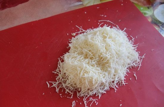 - На терке с мелкой перфорацией измельчаем российский сыр. Половину сырной массы откладываем в сторону.