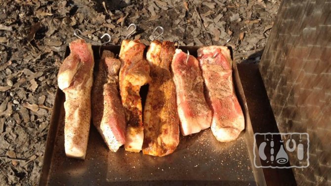 Раскладывать сало на решетке коптильни следует свободно, оставляя между кусками некоторое расстояние, для того чтобы дым свободно обтекал их со всех сторон.