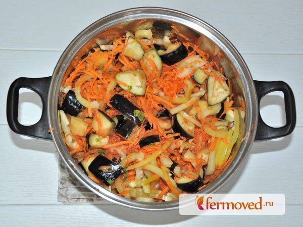 - В закипевшую смесь в кастрюле отправьте подготовленные морковь, перец и баклажаны. Все хорошо перемешайте и доведите до кипения.