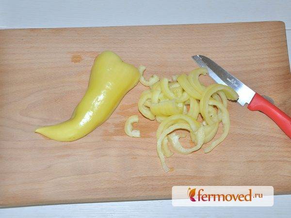 У сладкого болгарского перца удалите плодоножку (вместе с семенами), вырежьте перегородки, хорошенько его помойте и нарежьте соломкой.