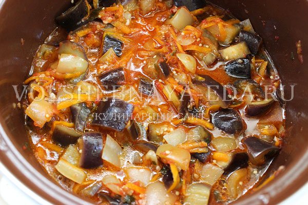 После специй добавляют баклажаны, морковь и перец. - Овощи варят на слабом огне. Через несколько минут после начала тушения, они должны полностью быть покрыты томатной пастой. Если достаточного количества сока не образовалось, то томаты добавляют в процессе приготовления.