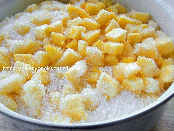 - Тыкву соединить с сахаром и фруктами, дать постоять 1 час
