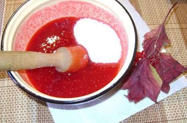 - Подготовленную массу перемешать с сахаром. Сахар и калина комбинируются в пропорции 2:1, т. е. количество сахара должно быть в 2 раза больше, чем ягоды.