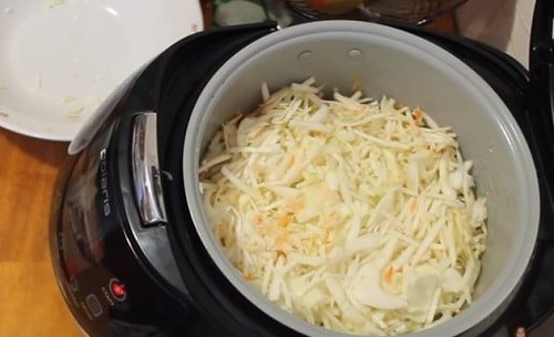 - Забросьте капусту. Переключите на функцию «Тушение», закройте крышку. Готовьте в течение 1 часа. Минут за 10 до окончания откройте крышку, старательно размешайте содержимое. Попробуйте блюдо на вкус, подкорректируйте его на соль. Закончите приготовление.