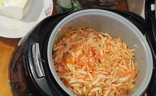Добавьте в чашу капустную нарезку, переведите режим на «Тушение». Перемешайте компоненты, закройте крышку. Установите таймер на 40 минут – это общее время тушения.