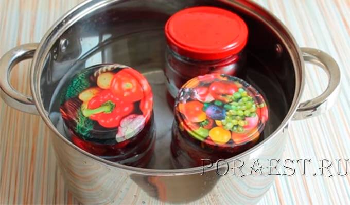 - Накрыть крышками, закрутить. Аккуратно достать банки из кастрюли, ещё раз пройтись по крышкам, закрутив их сильнее. Затем укутать консервацию чем-то тёплым и после полного остывания отправить на хранение.