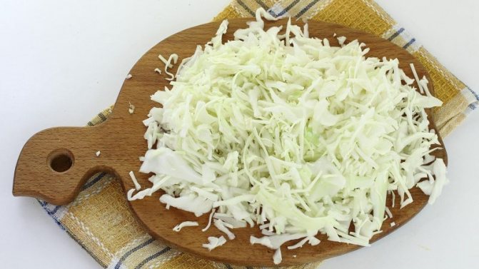 - Капусту шинкуем любым из способов. Удобно для этого иметь специальную терку, а можно просто нарезать с помощью ножа тонкими полосками. Капусту выкладываем в глубокую миску.