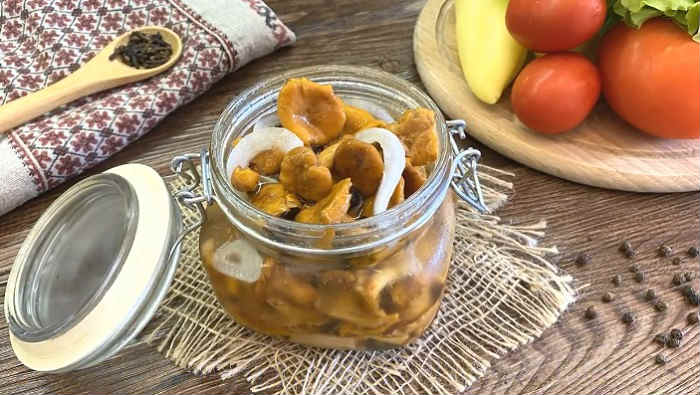 Этот способ потребует самое минимальное количество простых ингредиентов. Грибную закуску не потребуется закатывать, можно хранить в холодильнике в банке чуть более одной недели. Блюдо получается сочное, ароматное, хрустящее. Маринованные лисички приготовленные по такому варианту очень нравятся мужчинам — это идеальная закуска, которую хорошо подавать с горячительными напитками.