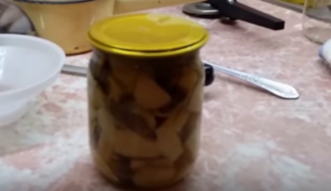 Когда грибы будут сварены, их необходимо переложить в кипящий маринад, довести до кипения и варить еще 20 минут на слабом огне. Затем их раскладывают по стерилизованным банкам, заливают маринадом (обязательно кипящим!) и сразу закатывают. Все закатанные банки переворачиваются вверх дном и укутываются до полного остывания.
