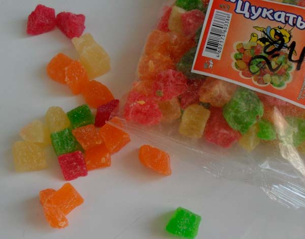 Поэтому магазинные цукаты такие яркие, да и еще в ярких упаковках. Нет ничего удивительно в том, что производитель хочет обогатиться. Хорошо, когда для этого он использует щадящие натуральные красители, но бывает и так, что их делают на чистой химии. А она превращает лакомство в отраву.