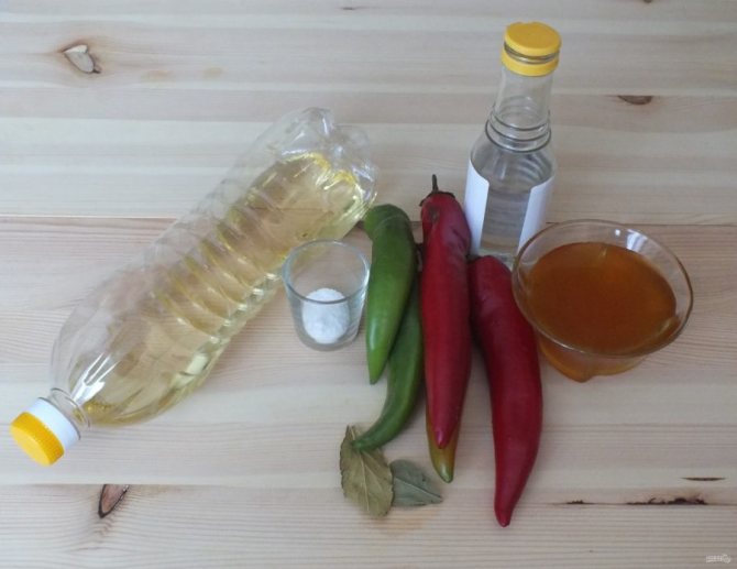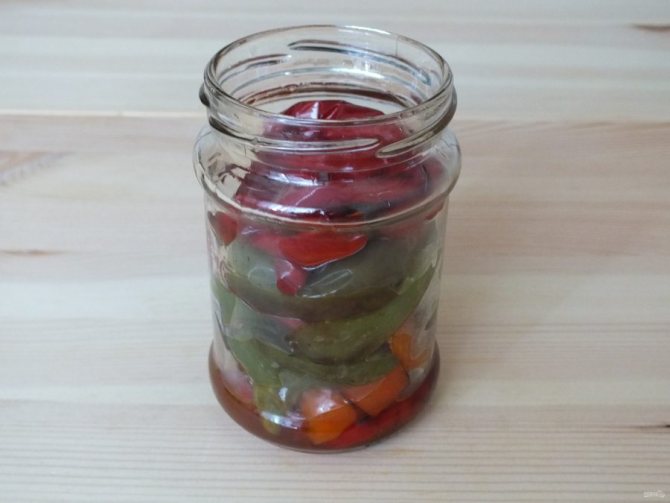 Перец очищают от семян, разрезают на 3—4 части. Из остальных ингредиентов необходимо сварить маринад, смешав их и доведя до кипения. Перец бланшируют 5 минут в маринаде, затем раскладывают в банки и заливают кипящим рассолом заготовки.