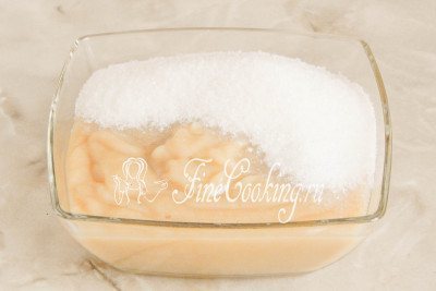 Агар-агар заливают обычной питьевой водой и дают ему постоять около часа. Далее к ингредиентам добавляют сахарный песок и ставят полученную смесь на плиту. Нагревать ее следует до температуры в 100 градусов.