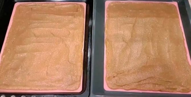 Теперь эту воздушную яблочную массу нужно будет высушить. Для этого берем прямоугольную форму с бортиками (примерно 20х30 сантиметров), застилаем ее бумагой для выпечки. Выкладываем белоснежный крем и разравниваем его лопаткой. Примерно 1 стакан заготовки нужно оставить для смазывания пластов — просто оставим его в холодильнике.