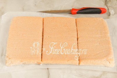Острым ножом разрезаем пласт рыхлой пастилы на 3 равные части. Только аккуратно, так как пастила очень нежная, она будто пронизана пузырьками воздуха.