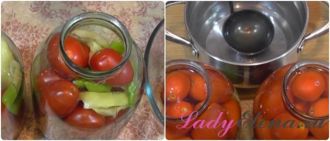 - Помидорами заполняют банку, между ними раскладывают болгарский перец и доверху заливают кипятком.