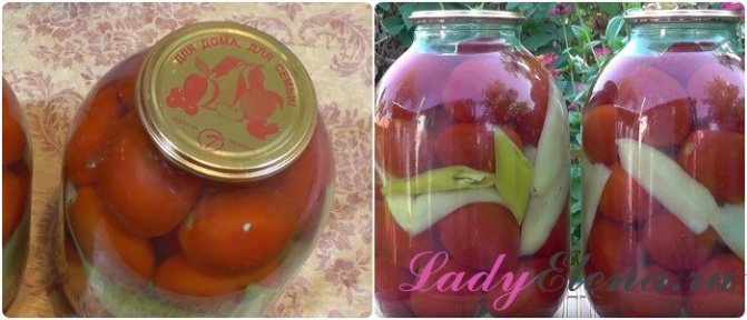 Еще делают заготовки, положив в банку к томатам нарезанную кружочками морковь, кольцами – сладкий перец. Прекрасно сочетание овощей с яблоками, их достаточно будет двух небольших на банку. Маринад готовится аналогично предыдущему рецепту.