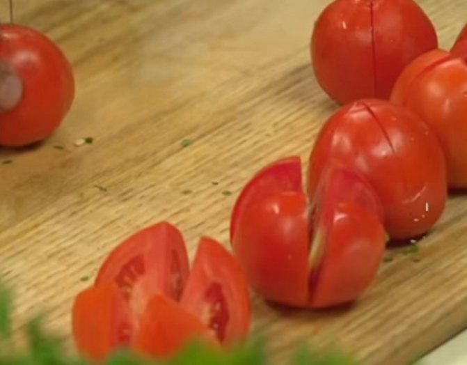 Каждый помидор нужно разрезать на четвертинки, не доходя до плодоножки, как показано на изображении. Важно, чтобы томаты были упругими и с толстой кожицей.
