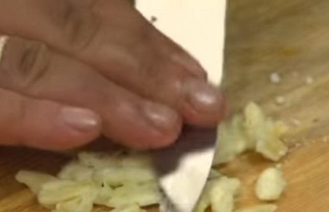 Чтобы подготовить чеснок, его нужно примять ножом, посыпать щепоткой соли и растереть плоской стороной ножа. Пересыпать вместе с перцем в отдельную миску.