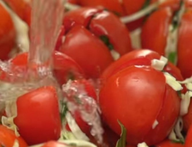 Помидоры перебираем, моем и на каждом их них делаем глубокий поперечный надрез, на доходя немного до конца (1-2 см), чтобы помидор не развалился. Начинку укладываем внутрь помидора, распределяя ее равномерно. Так поступаем со всеми помидорами, а затем укладываем их в заранее подготовленный бочонок (если его не окажется под рукой, можно обойтись обычной эмалированной кастрюлей). Укладывать плоды следует как можно более плотно.