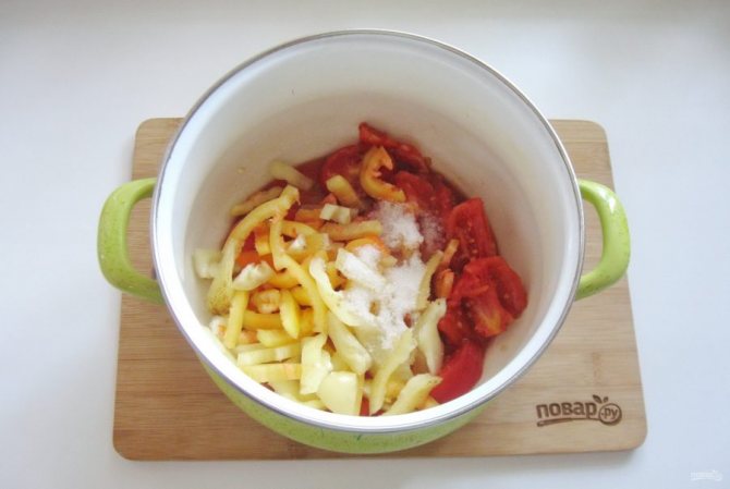 1. Помидоры вымыть, порезать дольками. Размер должен быть такой, что – б взял кусочек, и сразу скушал. Нарезку сразу отправляйте в подготовленную емкость. 2. Чеснок, перец перекрутить на мясорубке, отправить к помидорам. 3.