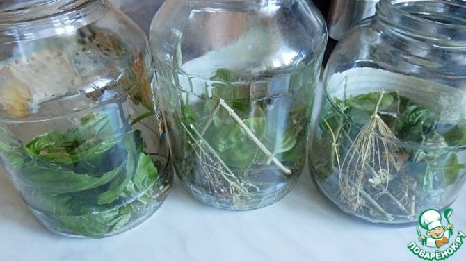 В чистые банки раскладываем специи и пряности которые вы любите и привыкли использовать. В этом рецепте я брала зонтики укропа и веточки базилика. Все «на глаз».