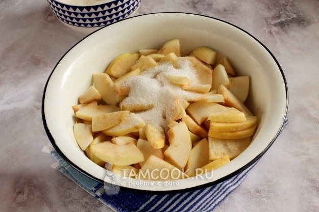 - Сочный, спелый фрукт тщательно промыть, разрезать на 2 части удалить семенную коробку. Нашинковать дольками одинакового размера. Подготовленный ингредиент выложить в чистую эмалированную емкость, пересыпая обильно каждый слой сахаром. Прикрыть и оставить в таком виде на 3-4 часа для того, чтобы фрукт успел пустить сок.