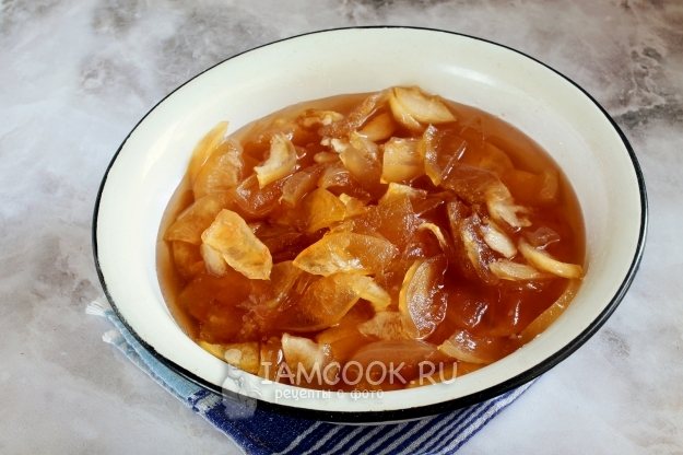 - Тем временем приступим к подготовке цитрусовых плодов. Промыть и обдать крутым кипятком. Нашинковать дольками, убирая по ходу работы косточки. Соединить проваренные яблоки с лимоном, аккуратно перемешать и готовить 30 минут.