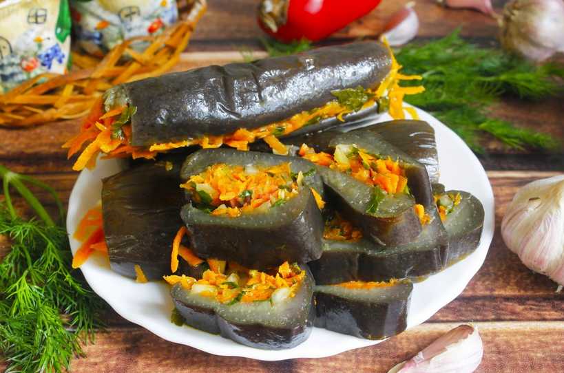 Баклажаны, фаршированные морковью и чесноком, маринованные под гнетом