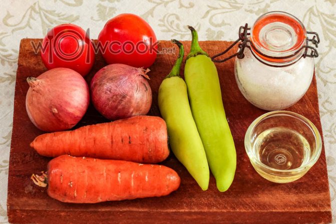 Для данного способа подходит рваная нарезка перца, кольцами, полукольцами. Морковь можно натереть на терке. Для блюда понадобятся овощи, компоненты в стандартном количестве: