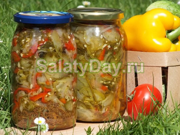 - Горячий салат распределить по стерилизованным емкостям и закупорить крышками. Отставить остывать, заранее перевернув и укутав каждую банку.
