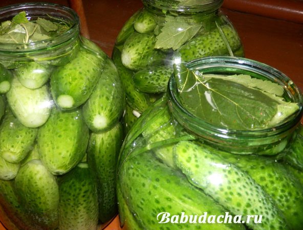 Соленые огурцы на зиму можно заготовить и в банках. Чтобы они выдержали необходимый срок хранения, добавляют немного водки. На два килограмма огурцов возьмем немного зонтиков укропа, 5 листьев смородины черной, столько же листьев вишни, один или два зубчика чеснока, листья хрена, перец горошком и 50 грамм водки.