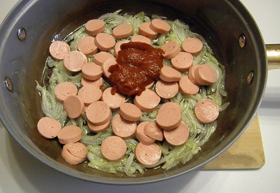 - Выложим к луку в сковороду сосиски и пасту томатную, размешаем и обжарим 2-3 минуты.