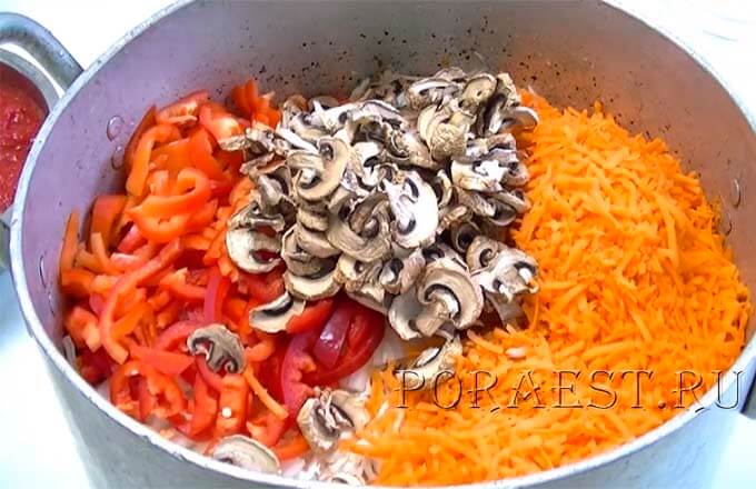 - Лук измельчить. Обжарить на сковороде лук, морковь и грибы. Добавить муку, томатную пасту и немного воды.