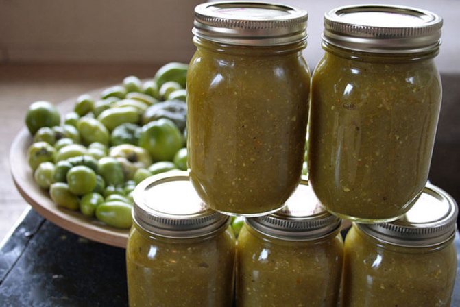 Это яство можно подавать к любому гарниру. Консервированный соус из зеленых помидоров, заготовленный на зиму, станет отличным дополнением к мясу, рыбе, овощам.