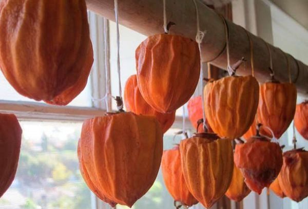 - Сушат хурму на нитках, пропущенных через хвостики, подвешенными в сухом, затененном, проветриваемом помещении.