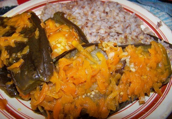 Нарезать баклажаны небольшими кубиками, положить в очень соленую воду и отваривать несколько минут (до умеренно мягкого, но не разлезшегося состояния). За это время можно нашинковать капусту, натереть морковку и чеснок, а перец, предварительно освободив от семечек, тонко нарезать вдоль.