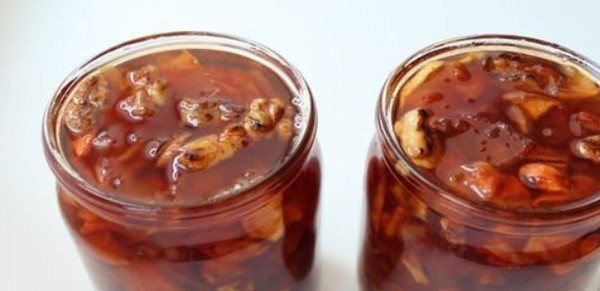 - Добавляем орехи, раскладываем массу по глиняным горшочкам и отправляем примерно на 3 часа в духовку, выставив температуру 150°. Консистенция готового варенья, должна стать тягучей, подобно меду.