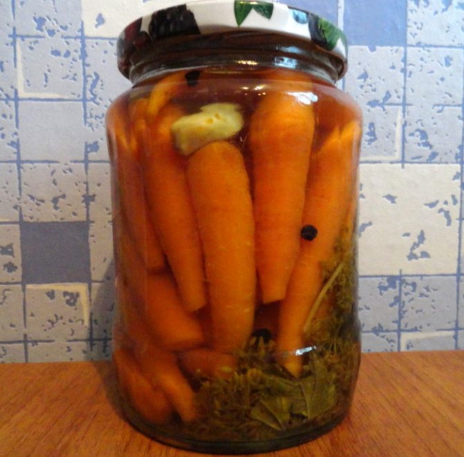 Морковь нарежьте колечками или небольшими брусочками. Отправьте в заранее простерилизованные банки, туда же положите чеснок. Залейте овощи маринадом и отправьте стерилизоваться на водяной бане с четверть часа.