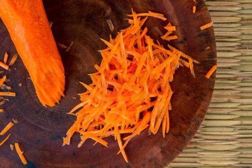 - Для этой закуски лучше всего подойдут сочные и ароматные осенние сорта корнеплодов. Морковку чистим и натираем на крупной терке.