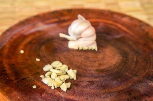 После этого очистите чеснок и разрежьте каждый из 2 зубчиков на несколько частей.