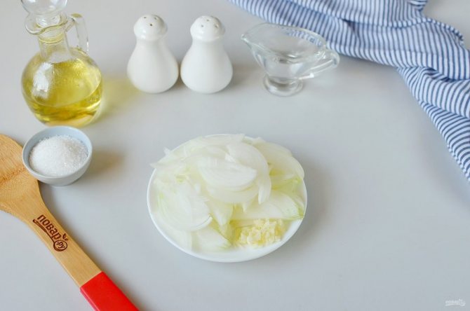 - Снимите с лука шелуху. Луковицу нарежьте тонкими полукольцами.